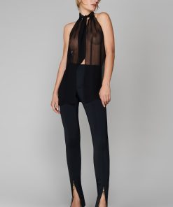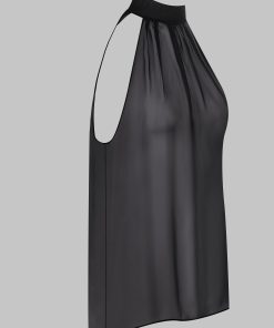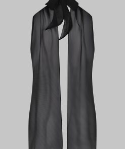 Crafted from ultra-sheer, floaty chiffon, this daring garment draws attention with its flowing drape. Structured with American-style armholes and a high, delicately pleated tie-neck that you can tie to suit you.