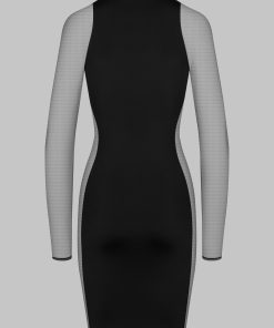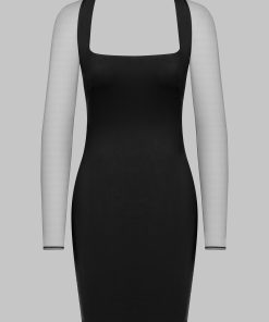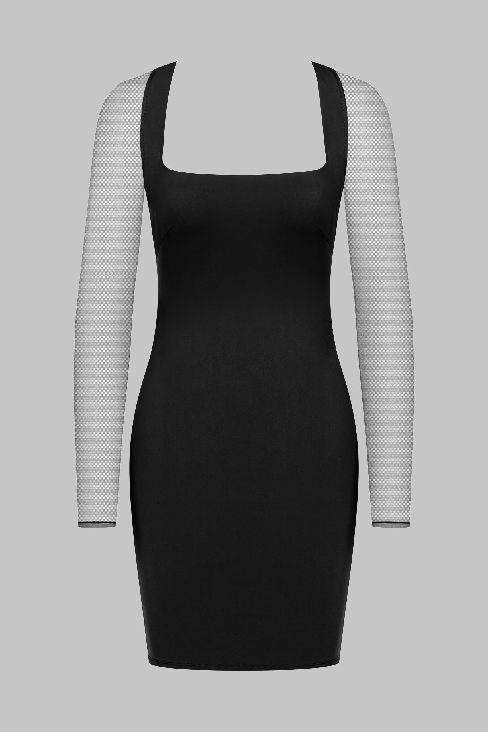 This mini dress stands out for its dual-material structure. Made from opaque stretch jersey with sheer tulle strips at the sides to elegantly accentuate the silhouette. Long sheer sleeves add a feminine touch to this fitted dress. The square neckline, inspired by the Italian style, creates an uplifted effect for a sophisticated look.