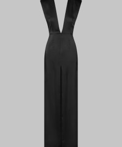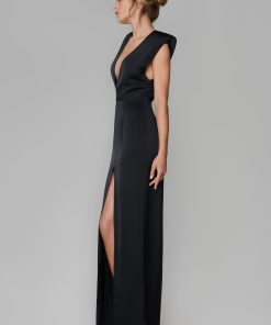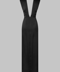This long dress is characterised by its straight cut and fitted waist. The striking satin-lined shoulder pads create a strong, structured silhouette. It is made from double-sided opaque satin for softness, a flowing style and incomparable quality. It has a seductive look with its double deep V neckline at the front and back. In the centre, a bold slit shows off the front of the legs. An invisible zip fastening on the side emphasises the impeccable fit of the waist.