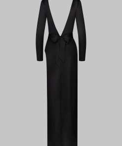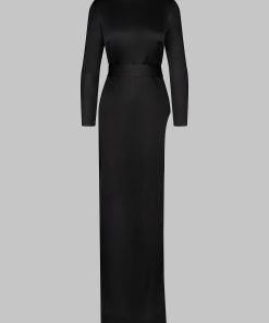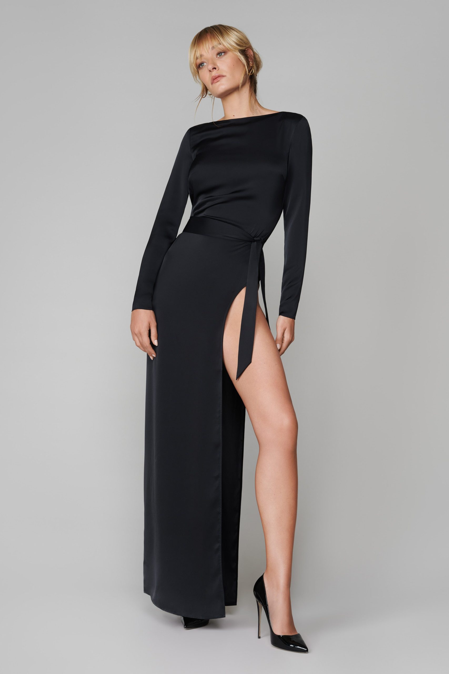 This backless dress stands out for its long, straight cut, which hugs the body and creates a sleek, assertive silhouette. It is made from double-sided opaque satin for softness, a flowing style and incomparable quality. A deep plunging vee at the back and a design that opens all the way up to the top of the leg is sure to turn heads. The boat neck emphasises a graceful neck. A wide, removable satin belt gives you structure at the waist.