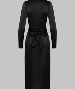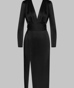 The midi wrap dress stands out for its structured, wrap design. Epaulettes adorned with flat pleats create a sleek, assertive silhouette. It is made from double-sided opaque satin for softness, a flowing style and incomparable quality. It has a seductive look with its deep V neckline and subtle leg-baring design.