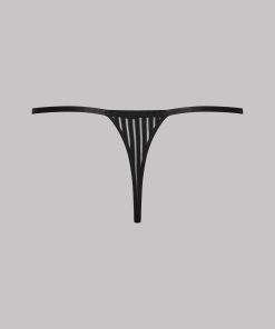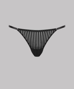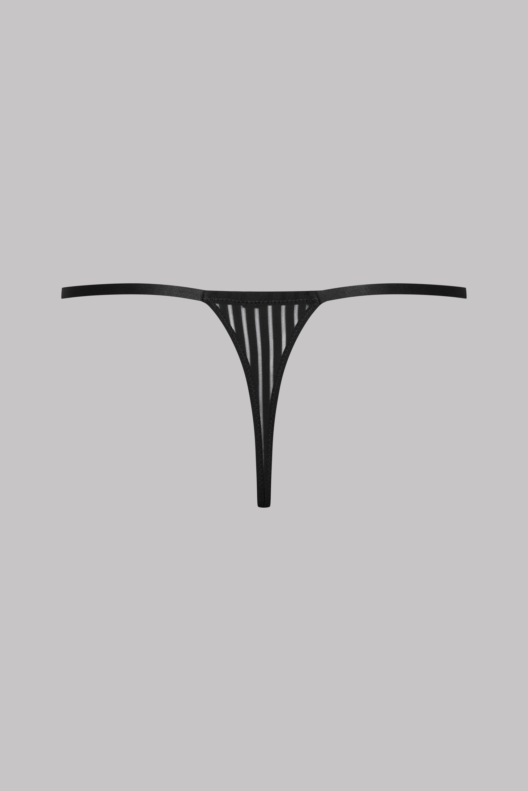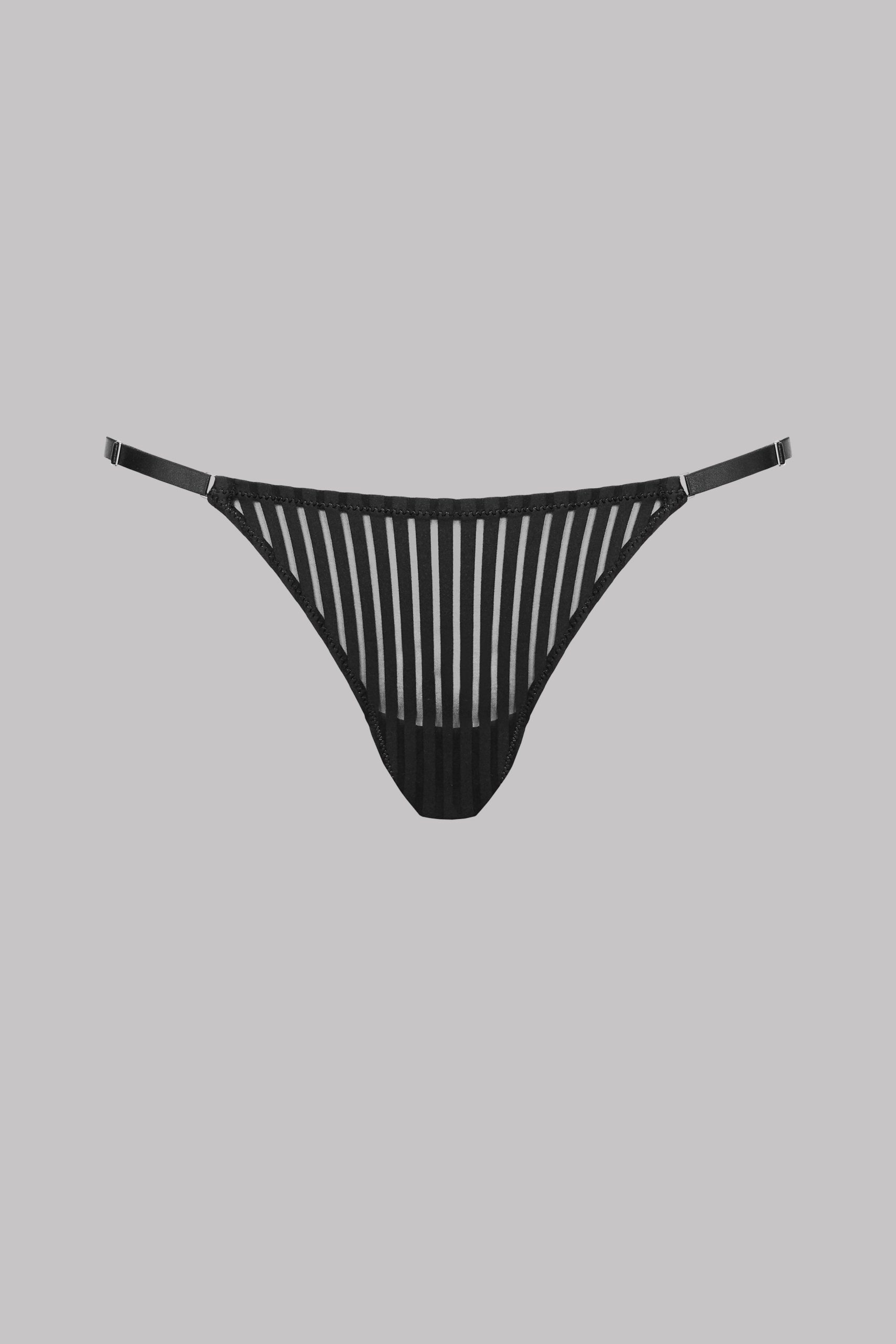 Microfibre adjustable mini thong with openwork, transparency and graphic stripes. Elastics with adjustable silver trim on the sides adapts to all body types.