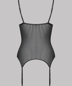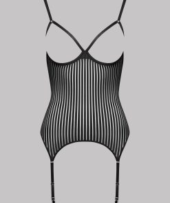 Microfibre cupless jumpsuit with openwork, transparency and graphic stripes. Underwired below bust outlines the curve of the breast and provides excellent support. Elasticated adjustable fixed straps at the back. 4 adjustable and removable suspenders with silver ornamental trims.