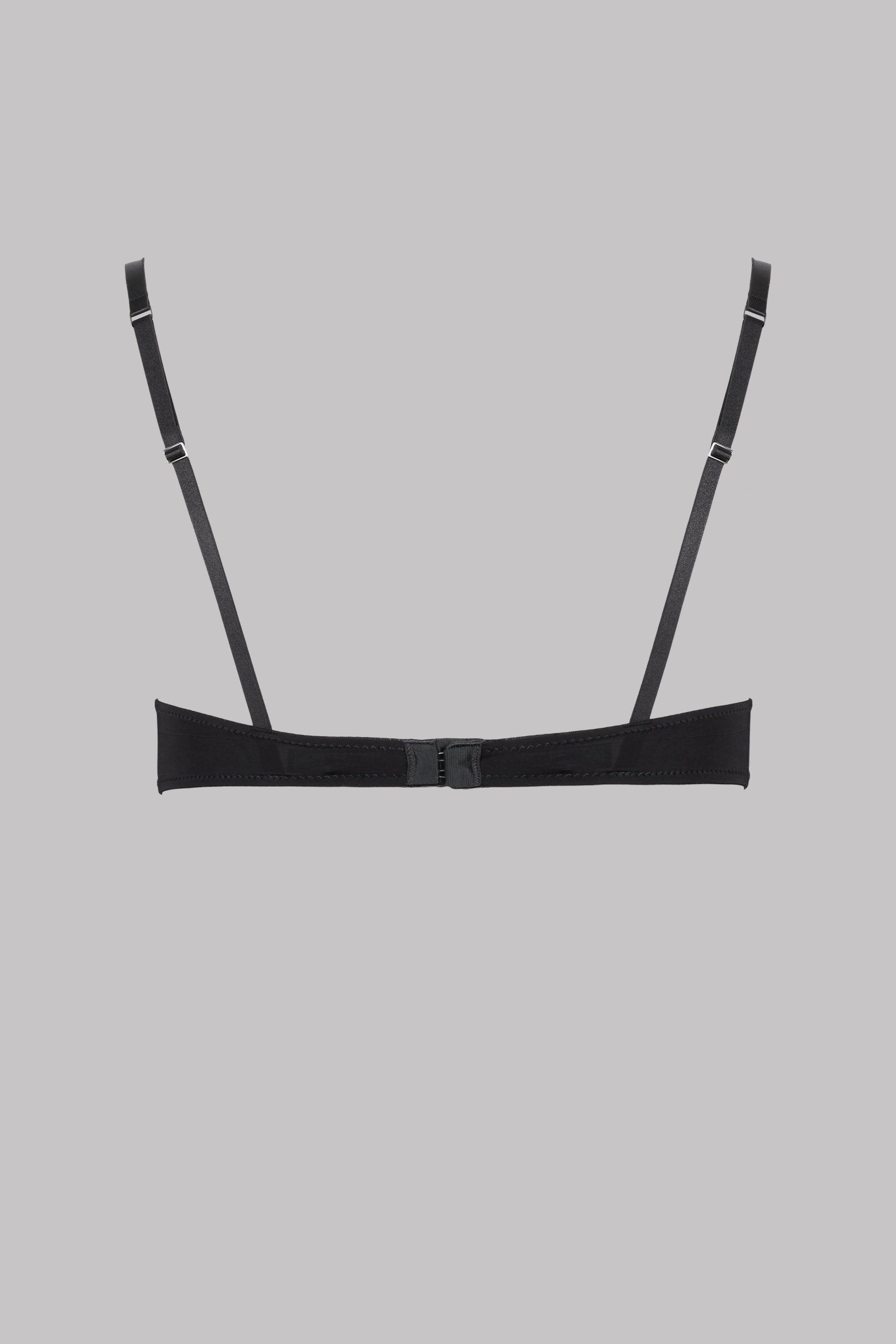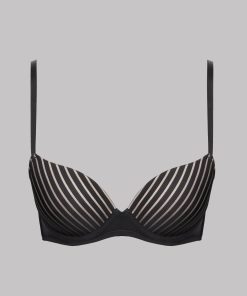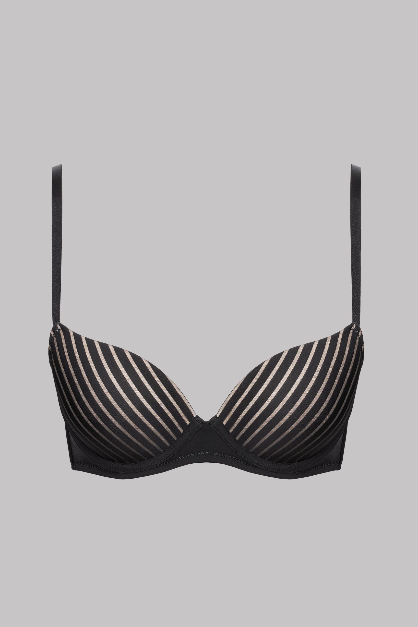 Microfibre-covered push-up bra with graphic stripes. Moulded cups with removable pads for a push-up bust effect. Underwired below bust with flexible ribs on the sides to provide excellent support. Plain microfibre back with adjustable hook-and-loop closure. Elastic, detachable straps with silver accents.