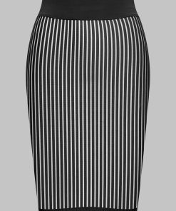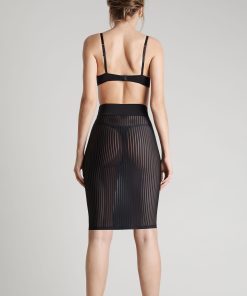 Microfibre mid-length skirt with openwork, transparency and graphic stripes that sculpts the figure. A wide elastic waistband plain black microfibre-covered structures the waist.