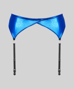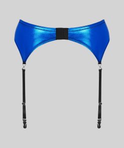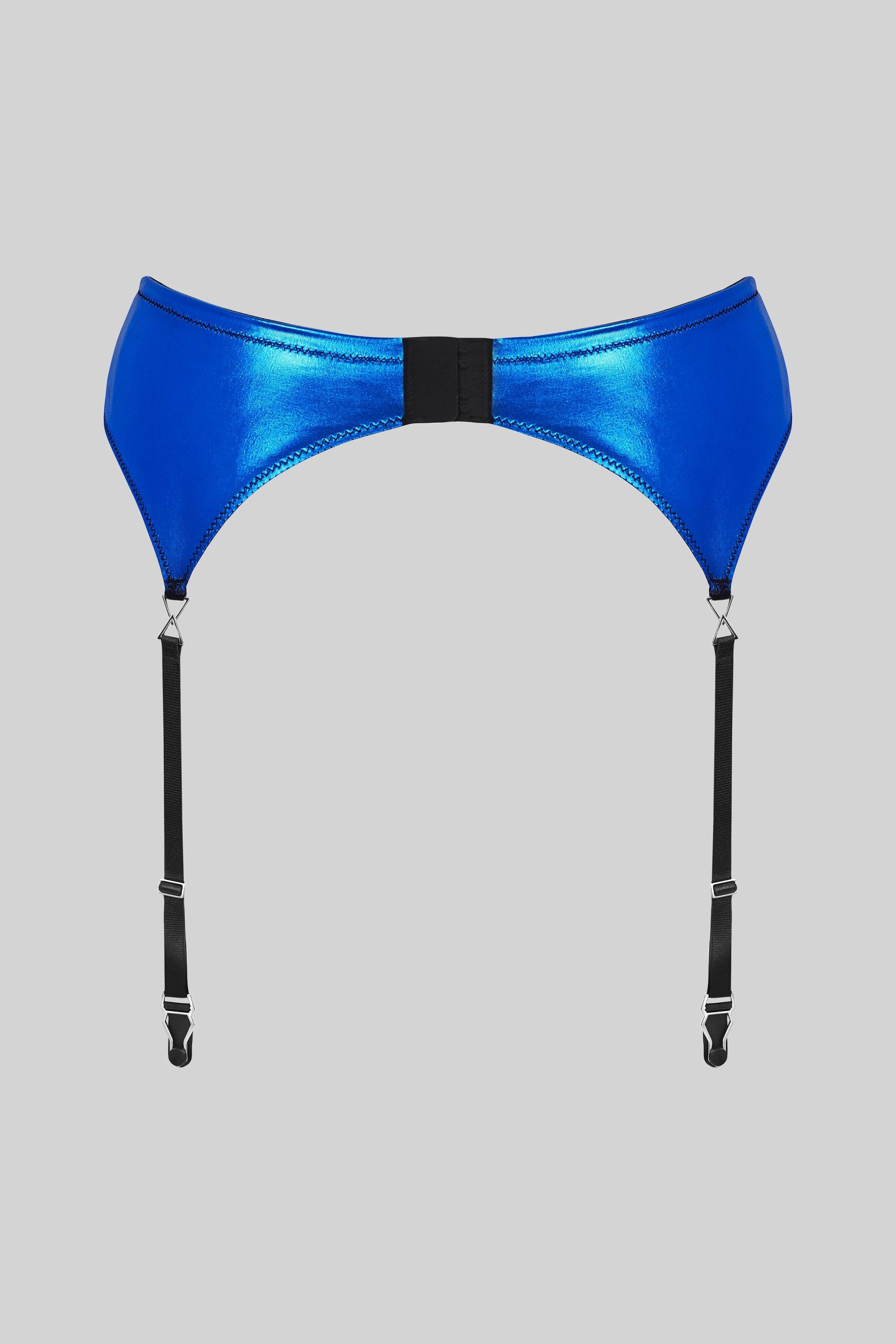 Garter belt in microfiber with metallic foil application. Elastic straps attach with butterfly fasteners. Adjustable fastening on the back.