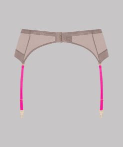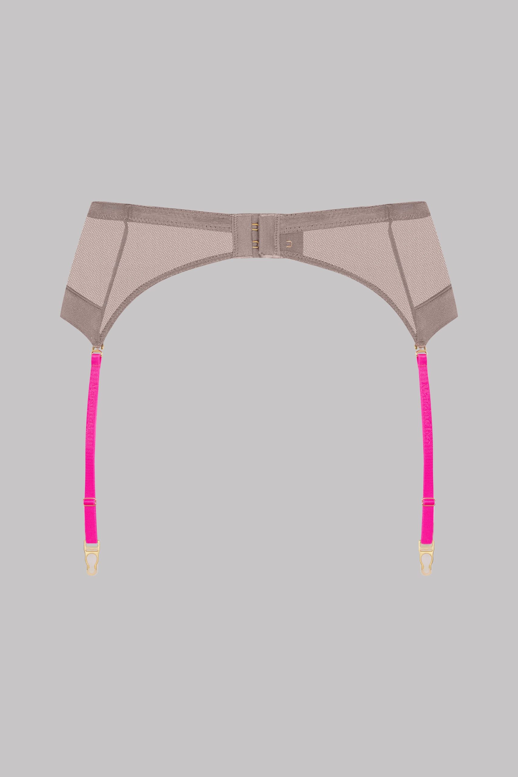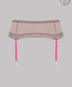 This nude colour suspender belt features soft mesh with a sheer iridescent appearance. Clip fastening on the back.