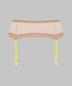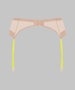 This nude colour suspender belt features soft mesh with a sheer iridescent appearance. Clip fastening on the back.