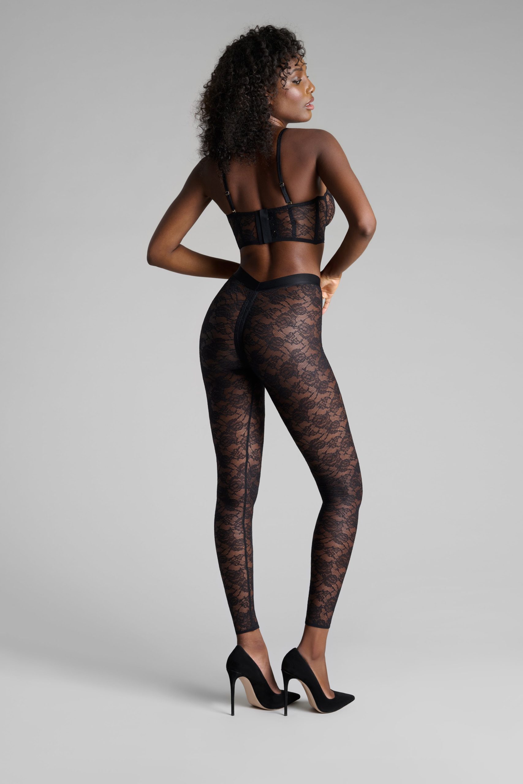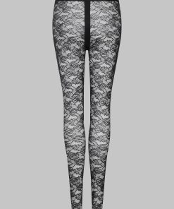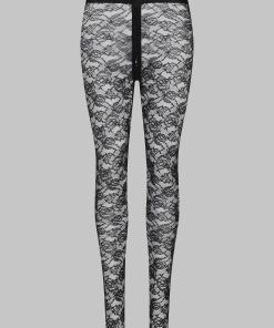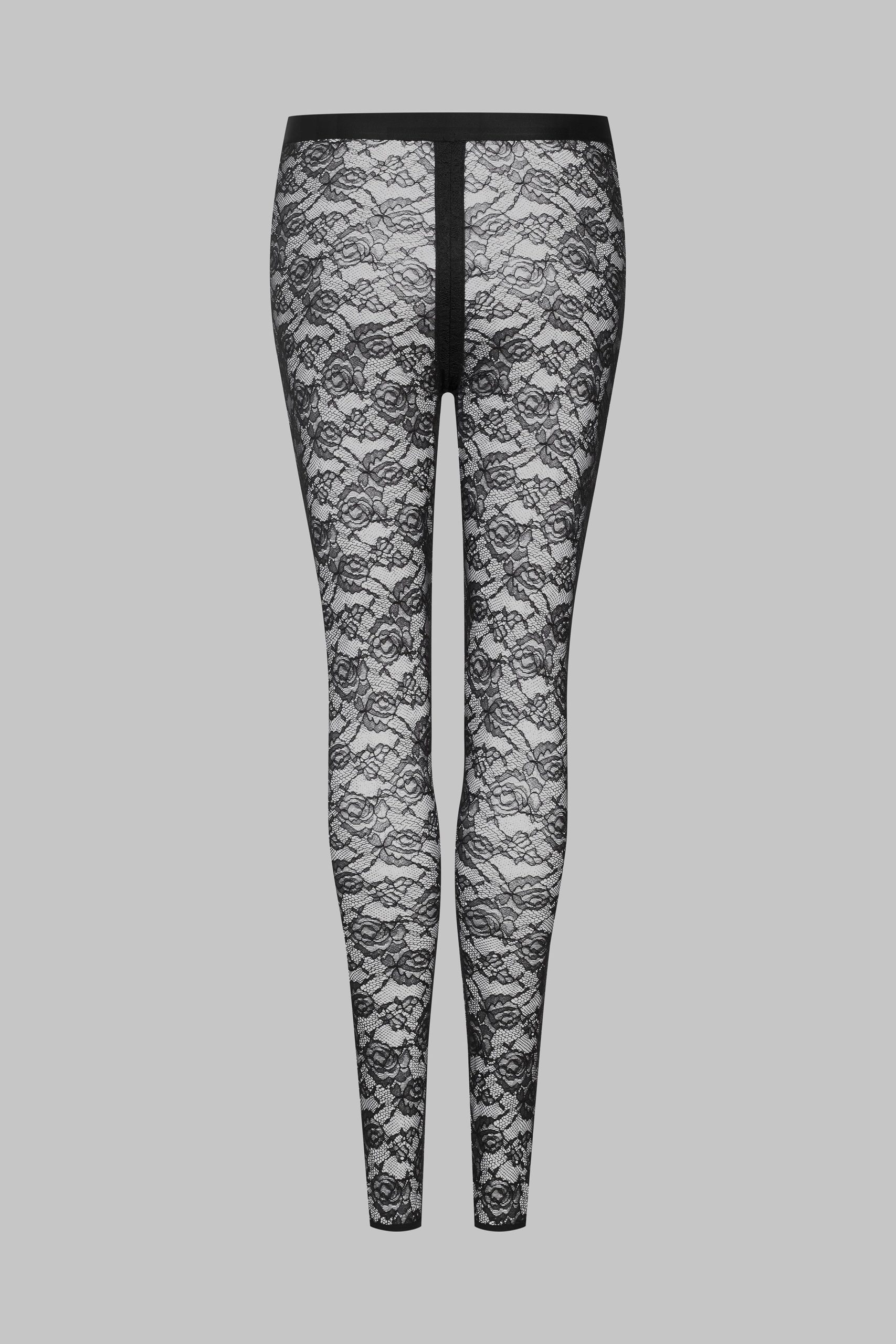 These leggings feature mostly recycled openwork lace. A wide waistband edged with a flat elasticated trim emphasises the curves for an ’80s style.