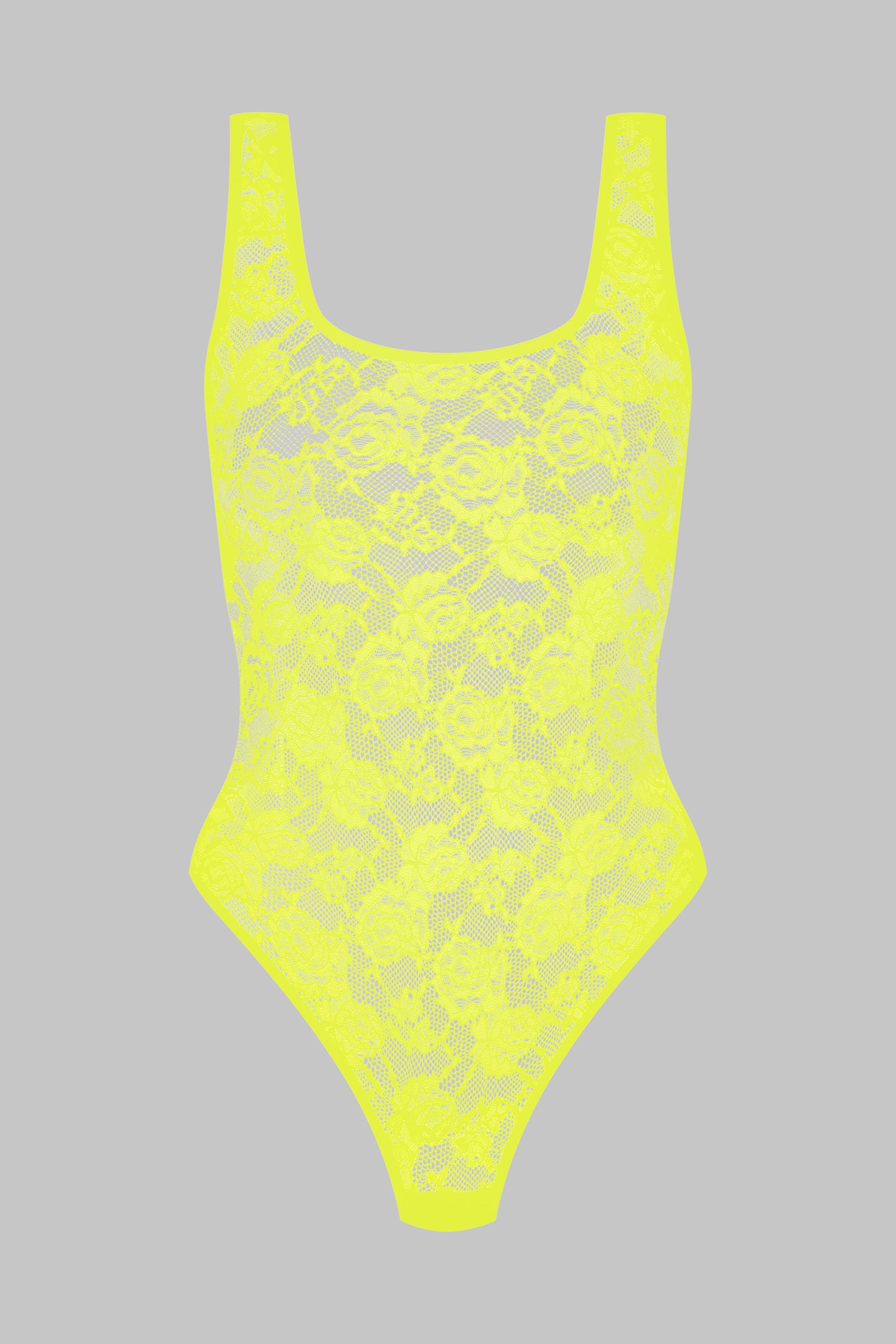 This neon-coloured thong bodysuit features mostly recycled openwork lace. Wide straps reveal a backless design with flat elasticated trim. Fitted cut edged with flat elasticated trim. Its plunging neckline, accentuated armholes and bold backless style take us back to the ’80s. Wear on its own or under a garment from the Maison Close wardrobe.