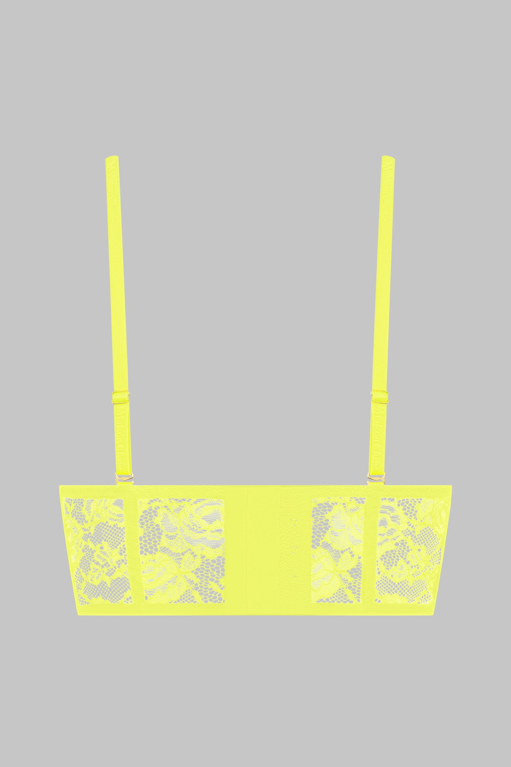 This neon-coloured balconette bra features mostly recycled openwork lace.Underwired cups that fit and shape the breasts perfectly. Bustier design with flexible vertical boning in the front and back. Fastens at the back with a smooth, subtle adjustable clip. Signature adjustable and removable neon straps with gold accessories. Swap whenever you like with any other Signature items available in various colours. An opportunity for each Muse to create their own zingy mix and match.