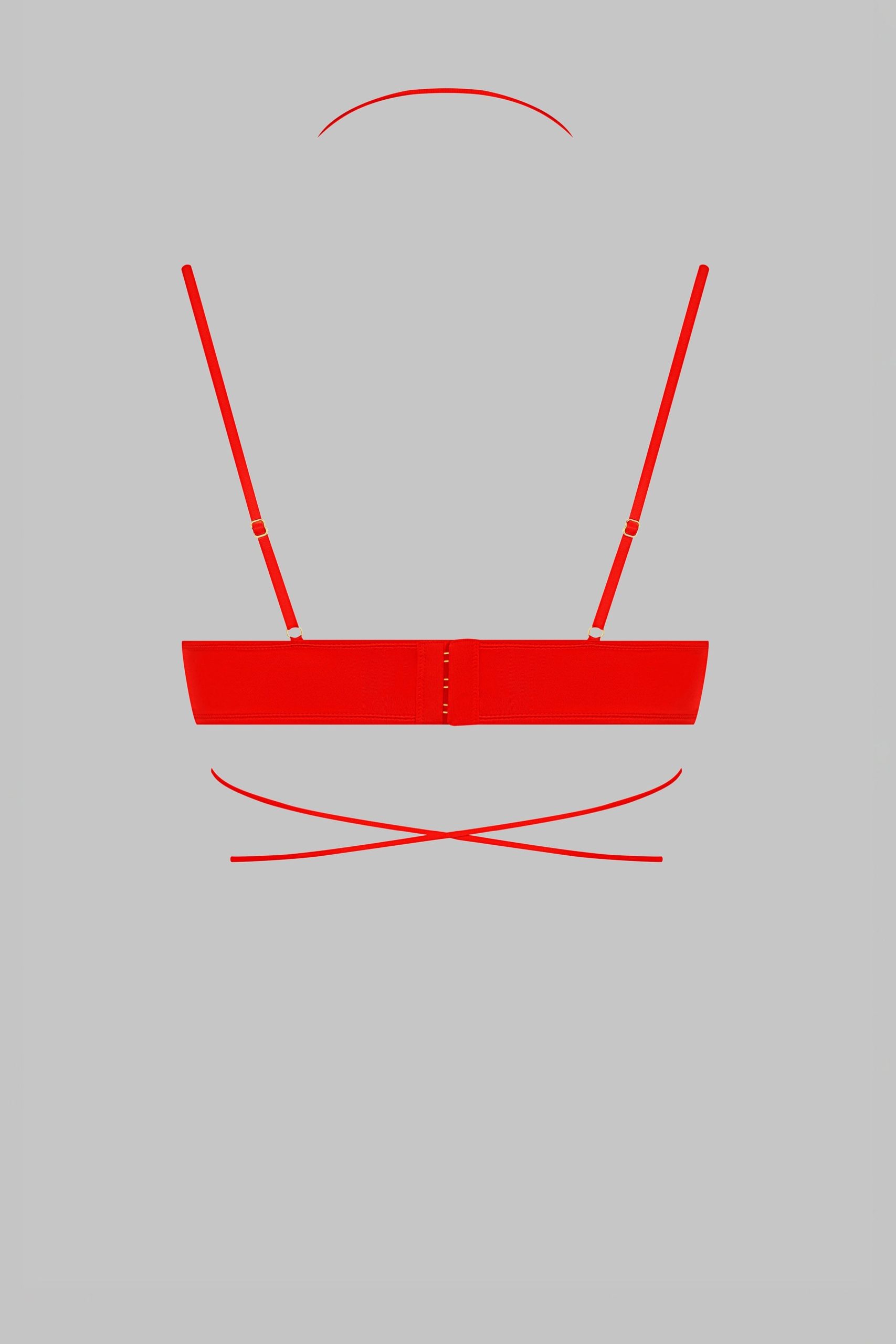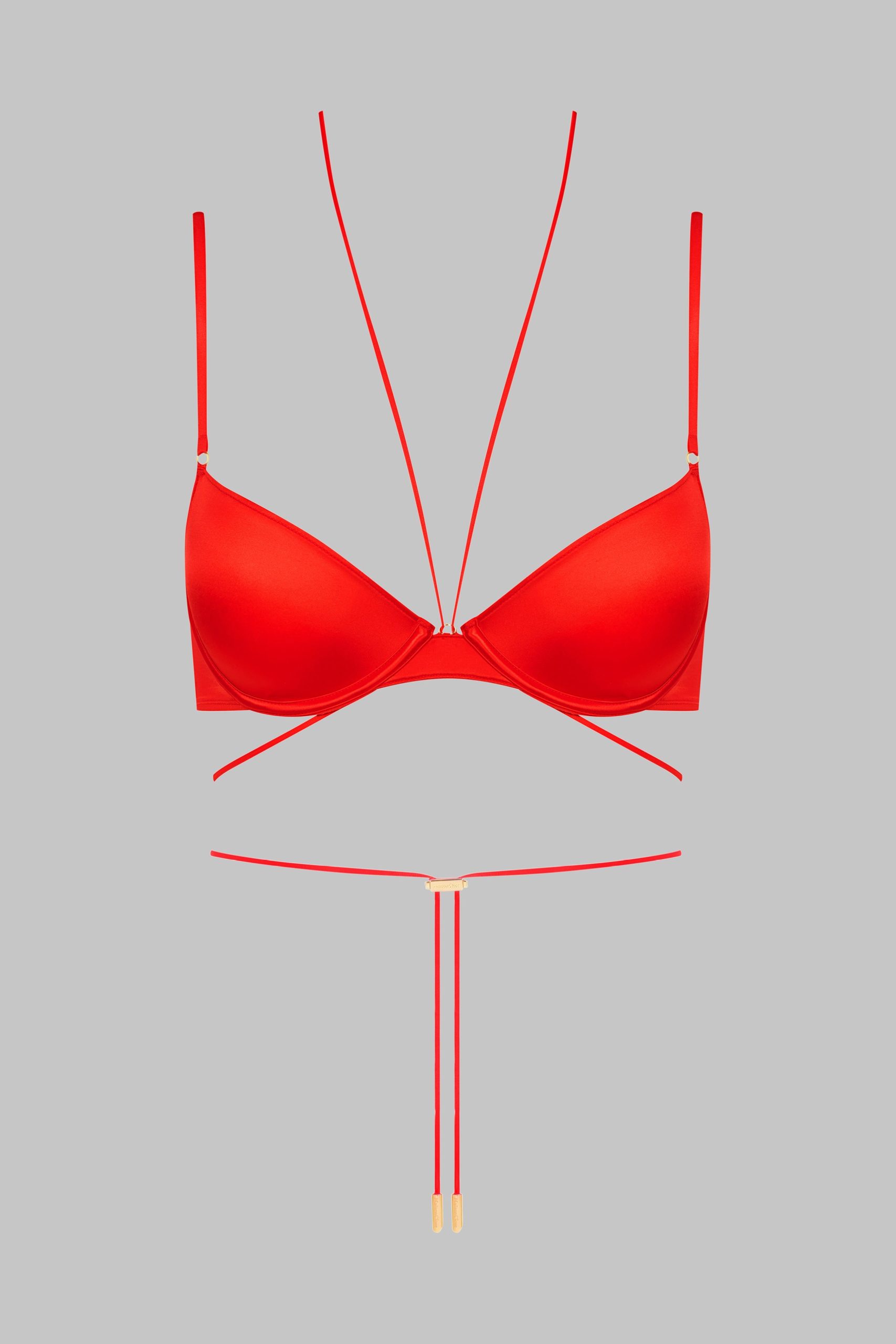 Underwired balconette bra, combining satin softness and style. Designed to fit the shape of your breasts perfectly thanks to its seamless moulded cups. Totally removable and adjustable thanks to a unique adjuster and gold lipstick accessories by Maison Close, the lacing around the neck enhances your décolleté while allowing you to personalise it as you wish. The flat and adjustable fine straps ensure a perfect fit. An elasticated band around the chest perfectly hugs and shapes the bust. Adjustable hook-and-eye fastening at the back.
