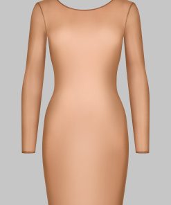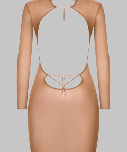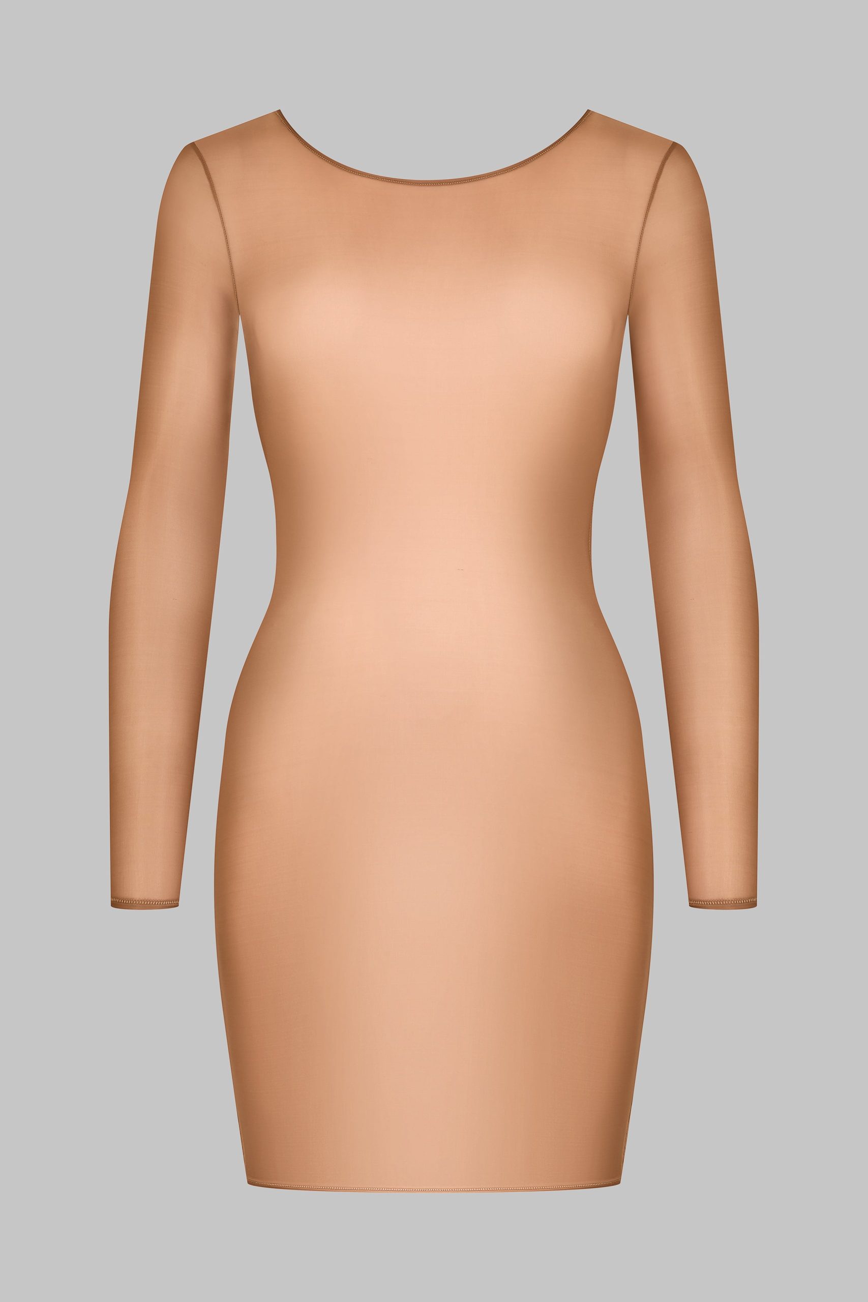 Short long sleeve dress with boat neckline crafted from a fine jersey with shiny, subtly sheer reflections. The front features a minimalist and refined silhouette, while the back is fully revealed down to the small of the back with delicately ruched lacing at the neck. The lacing is adjustable thanks to unique sliders and gold lipstick accessories signed by Maison Close.