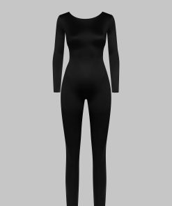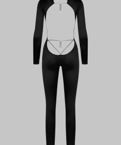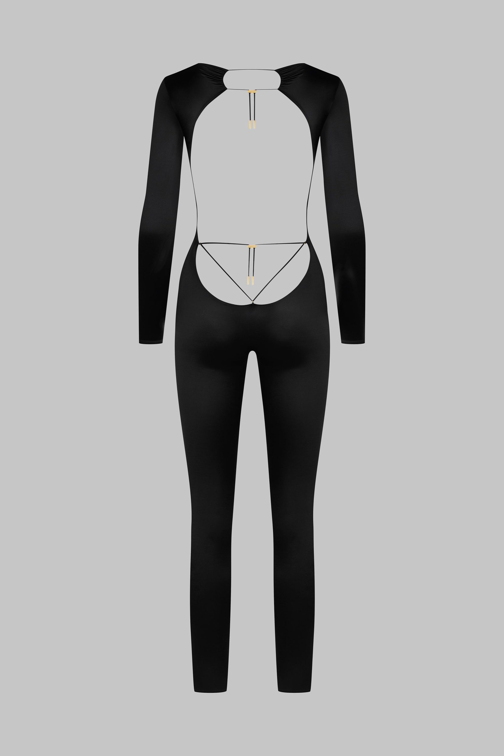 Long-sleeved catsuit with boat neckline, combining satin softness and unique style. A pared-down, minimalist silhouette at the front counteracts a back completely revealed to the small of the back by lacing detailing delicately pleated at the neck. The lacing is adjustable thanks to unique adjusters and gold lipstick accessories by Maison Close.
