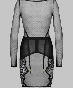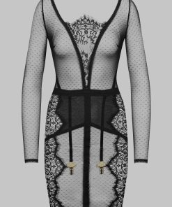 Long-sleeved short dress adorned with a gold cross to team Gothic lace with Swiss dot stretch mesh. Elasticated picot trim details structure the silhouette. Trimmed with 4 suspender straps with adjustable, detachable extenders with gold crosses. This body-con dress turns into a haunting ready-to-wear garment that can be worn day and night.