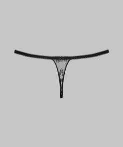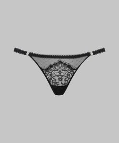 Mini thong teaming Gothic lace with Swiss dot stretch mesh. A mini lace triangle on the back accentuates the crease of the buttocks. Elasticated picot trim embellished with two gold rings at the front.