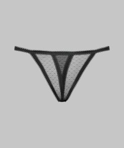 Openable thong adorned with a gold cross to team Gothic lace with Swiss dot stretch mesh. A mini lace triangle on the back accentuates the crease of the buttocks. Elasticated picot trim and openable wrapover panels made of Swiss dot mesh in front.