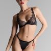 Openable thong adorned with a gold cross to team Gothic lace with Swiss dot stretch mesh. A mini lace triangle on the back accentuates the crease of the buttocks. Elasticated picot trim and openable wrapover panels made of Swiss dot mesh in front.