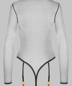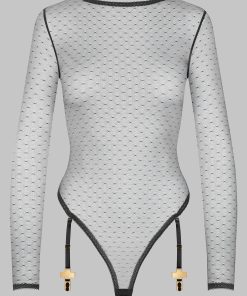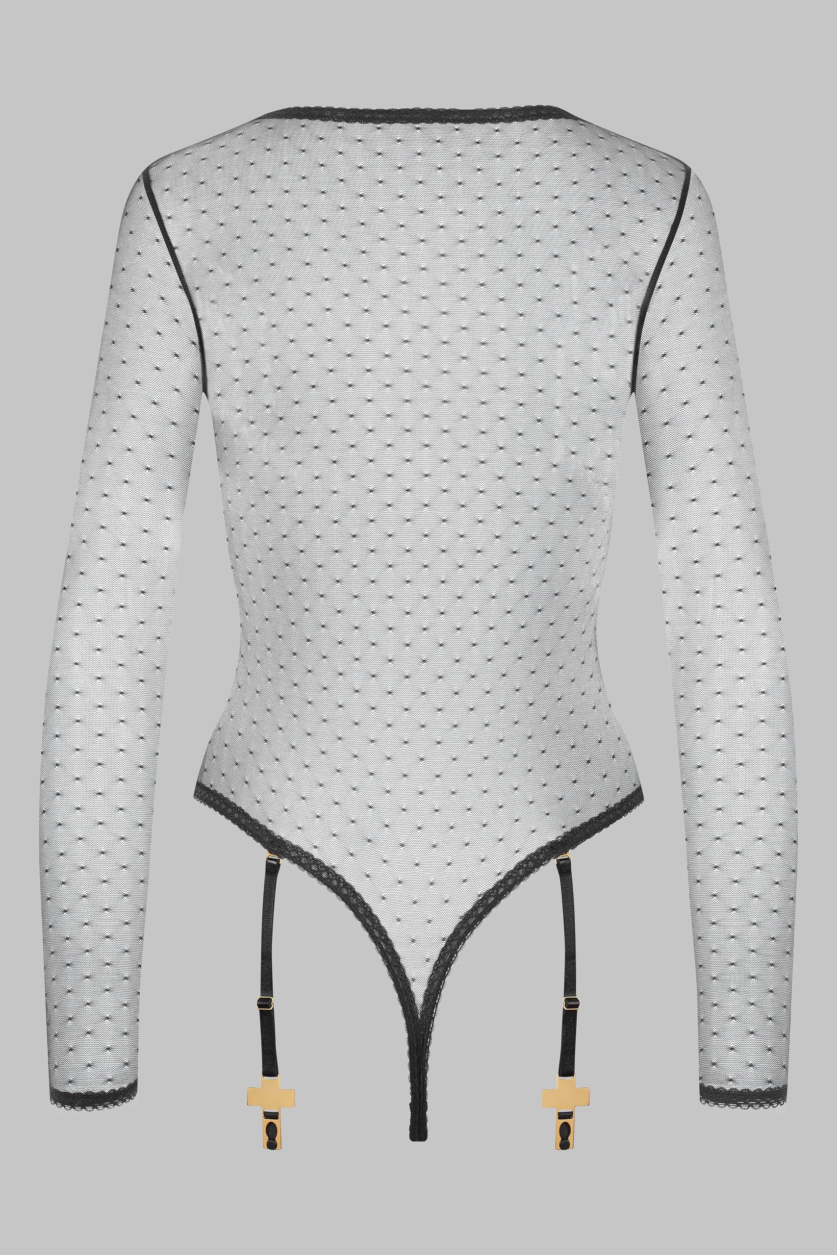 Long-sleeved thong bodysuit in stretch Swiss dot mesh. Elasticated picot trim details structure the silhouette. Four detachable, adjustable suspender straps embellished with golden crosses. Adjustable hook-and-eye fastening at the crotch.