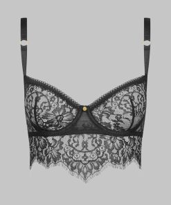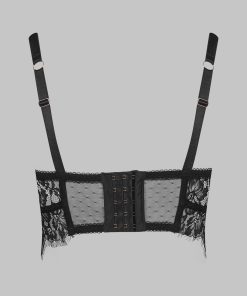 Corbeille bra with underwiring teaming a stiff Gothic lace with Swiss dot mesh. Wide, adjustable elasticated straps for perfect support. Adjustable hook-and-eye fastening on the back. A haunting piece of lingerie that is iconic of the Inspiration Divine collection.