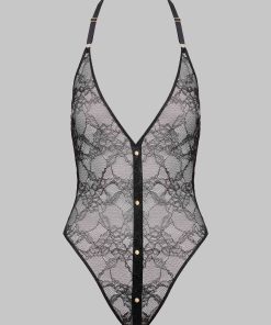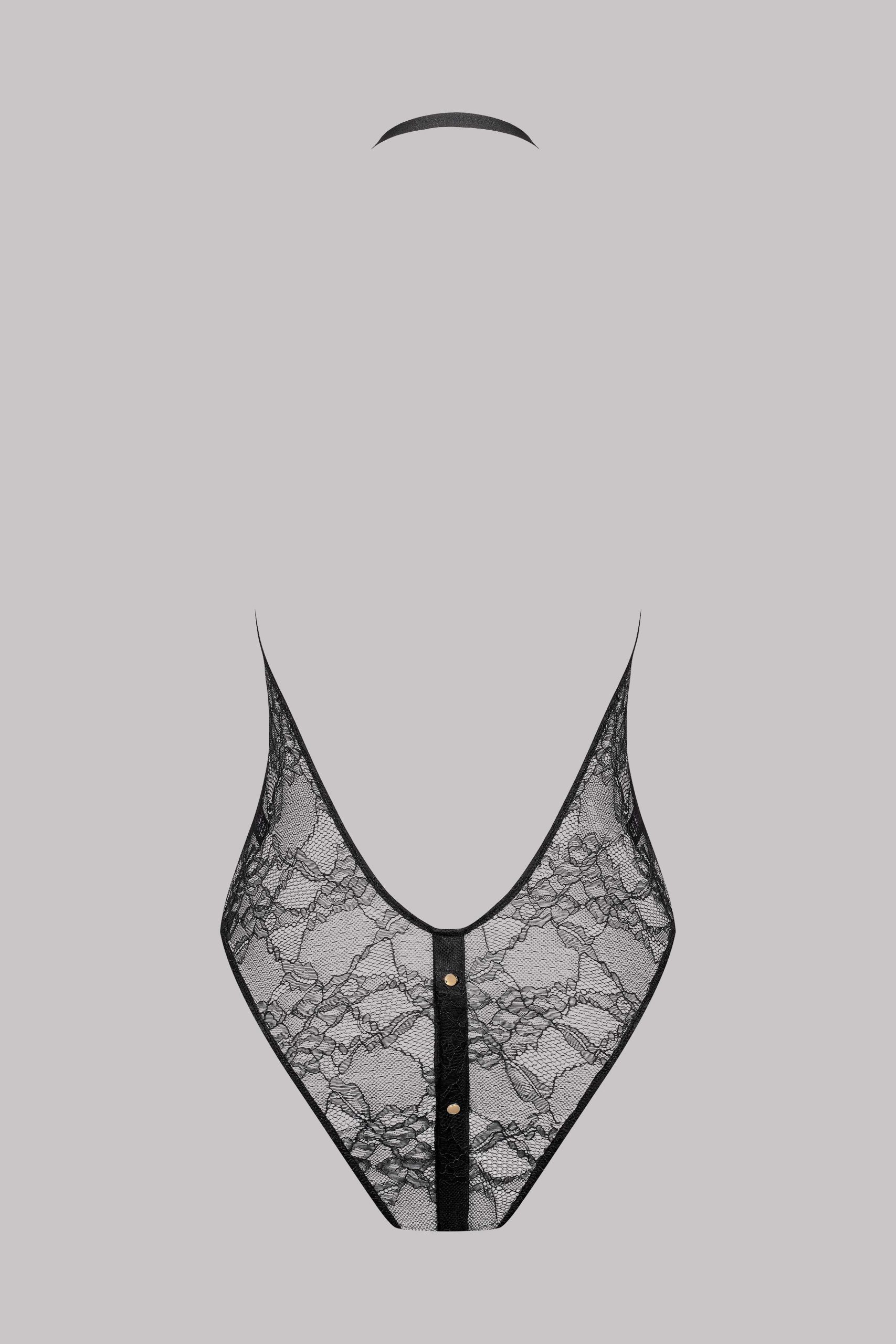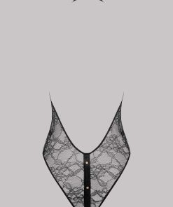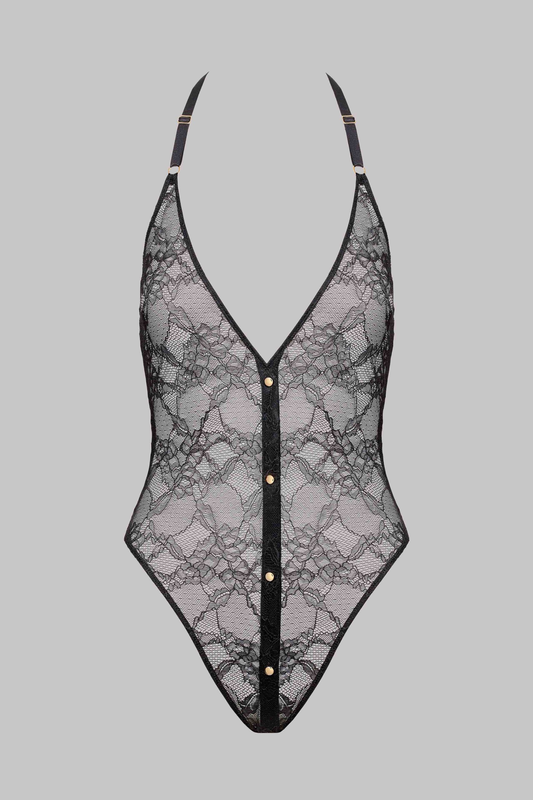 Sheer stretch lace bodysuit. Opens front to back with magnetic gold press-studs. V-neck and plunging back.