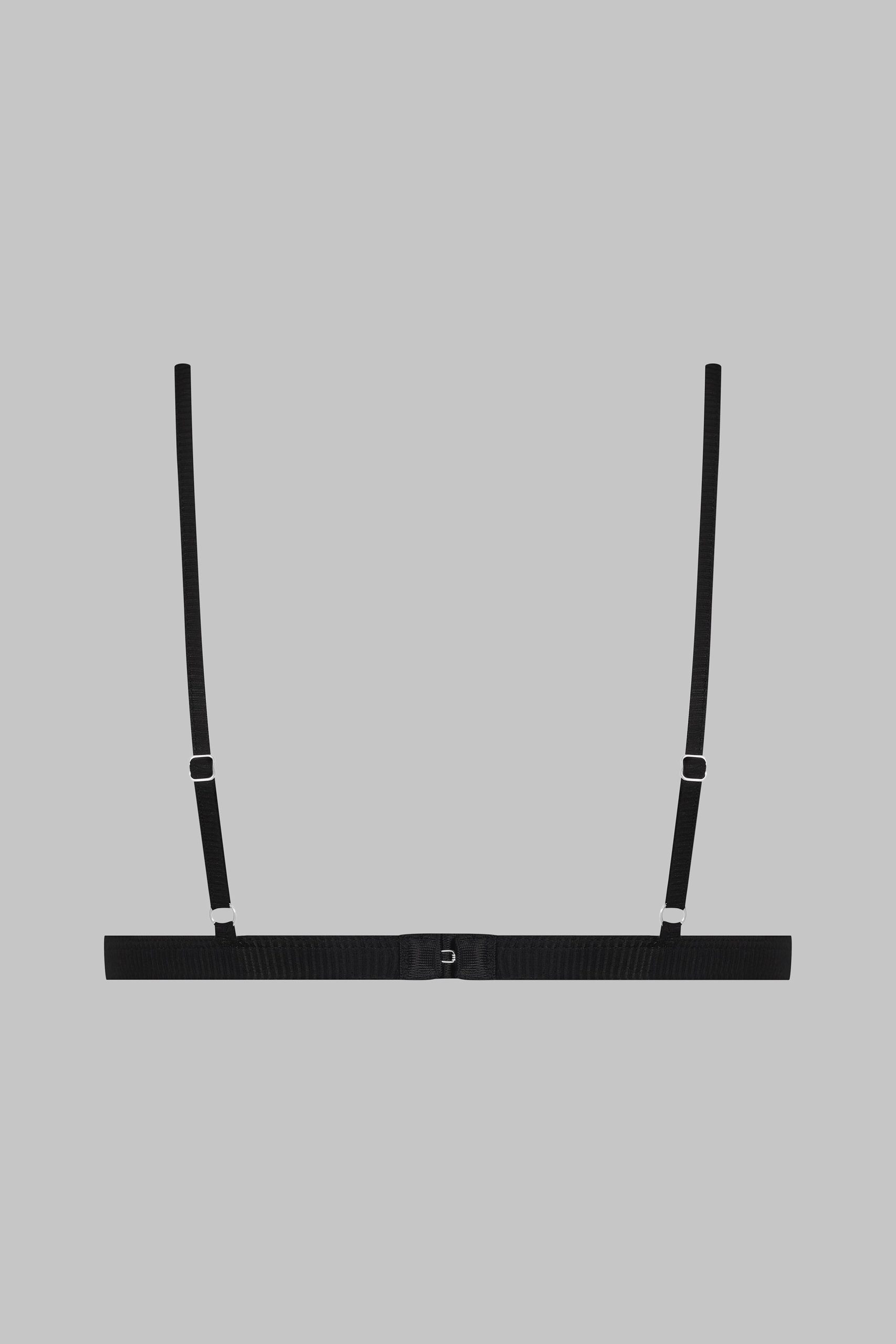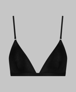 Triangle bra without underwiring and a unique feel. Stretchy, ultra-soft, lightweight ribbed modal that stretches and has a sheer, shiny sheen. Non-removable modal-covered spaghetti straps with adjustable silver trim. Adjustable hook-and-eye fastening on the back.