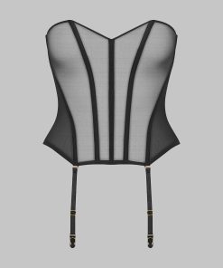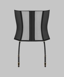 Garter belt corset in 100% sheer mesh. Structured corset with flexible vertical boning in the front and back. Transverse seams extended into adjustable and removable garters. Seamless lined sides for an enhanced silhouette.