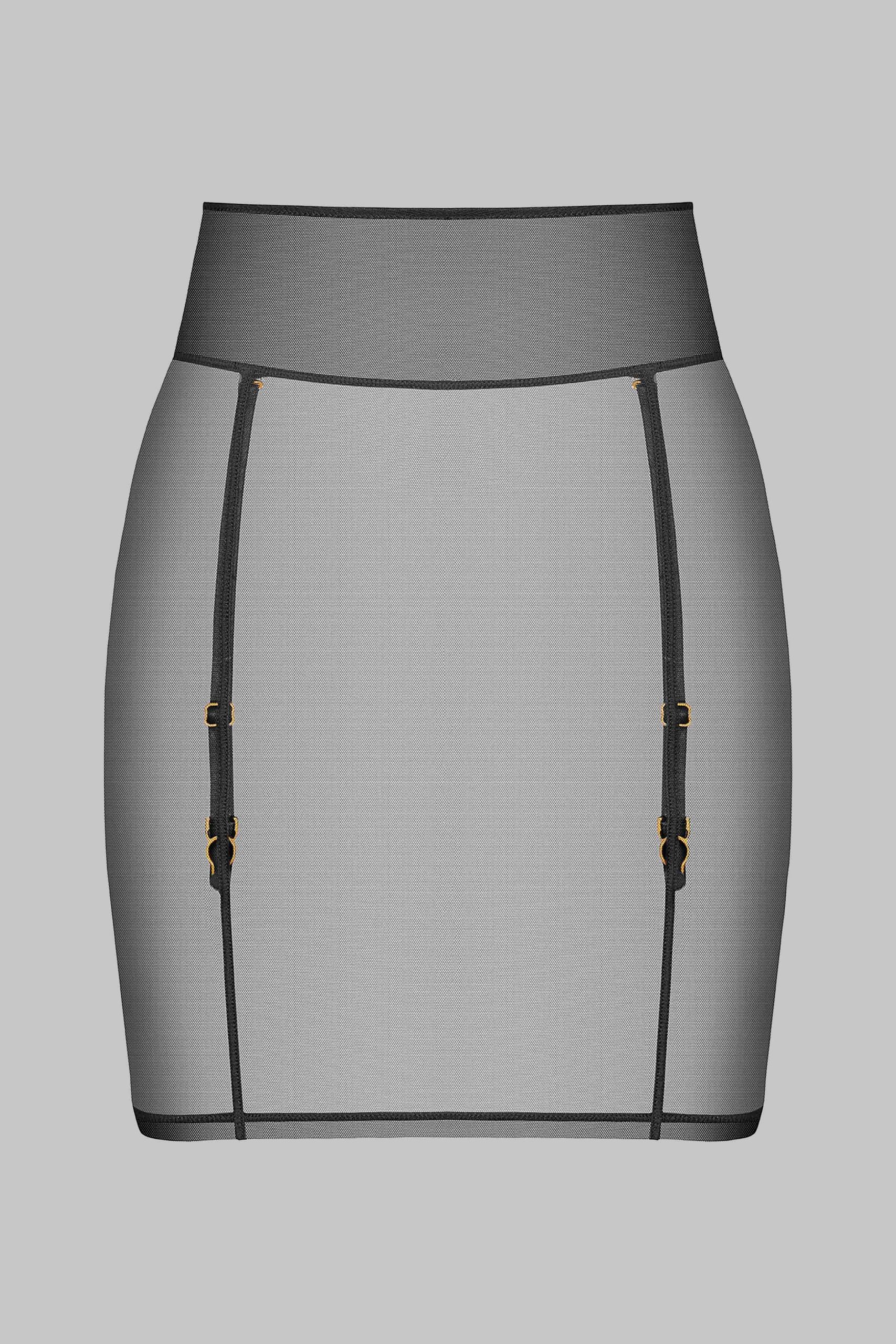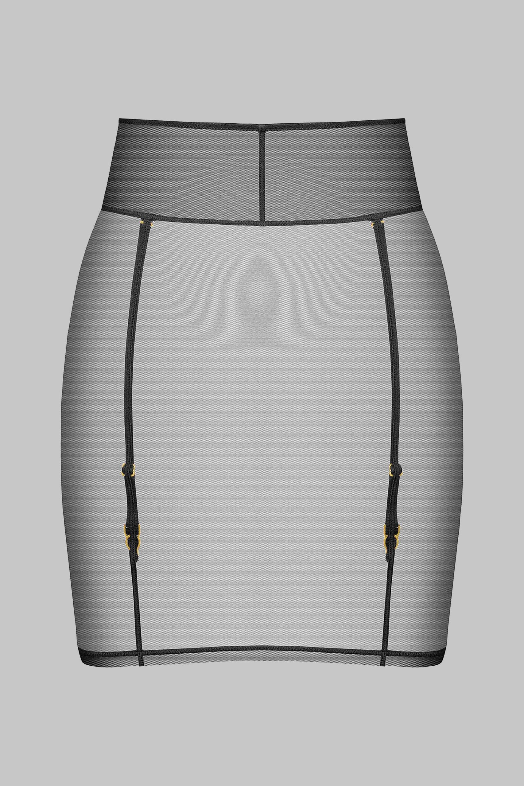Short garter skirt in 100% sheer mesh. Lined belt for a snug fit. Cross seams coordinate with the removable garters. A slip skirt to wear over other pieces in the collection or under your clothing.