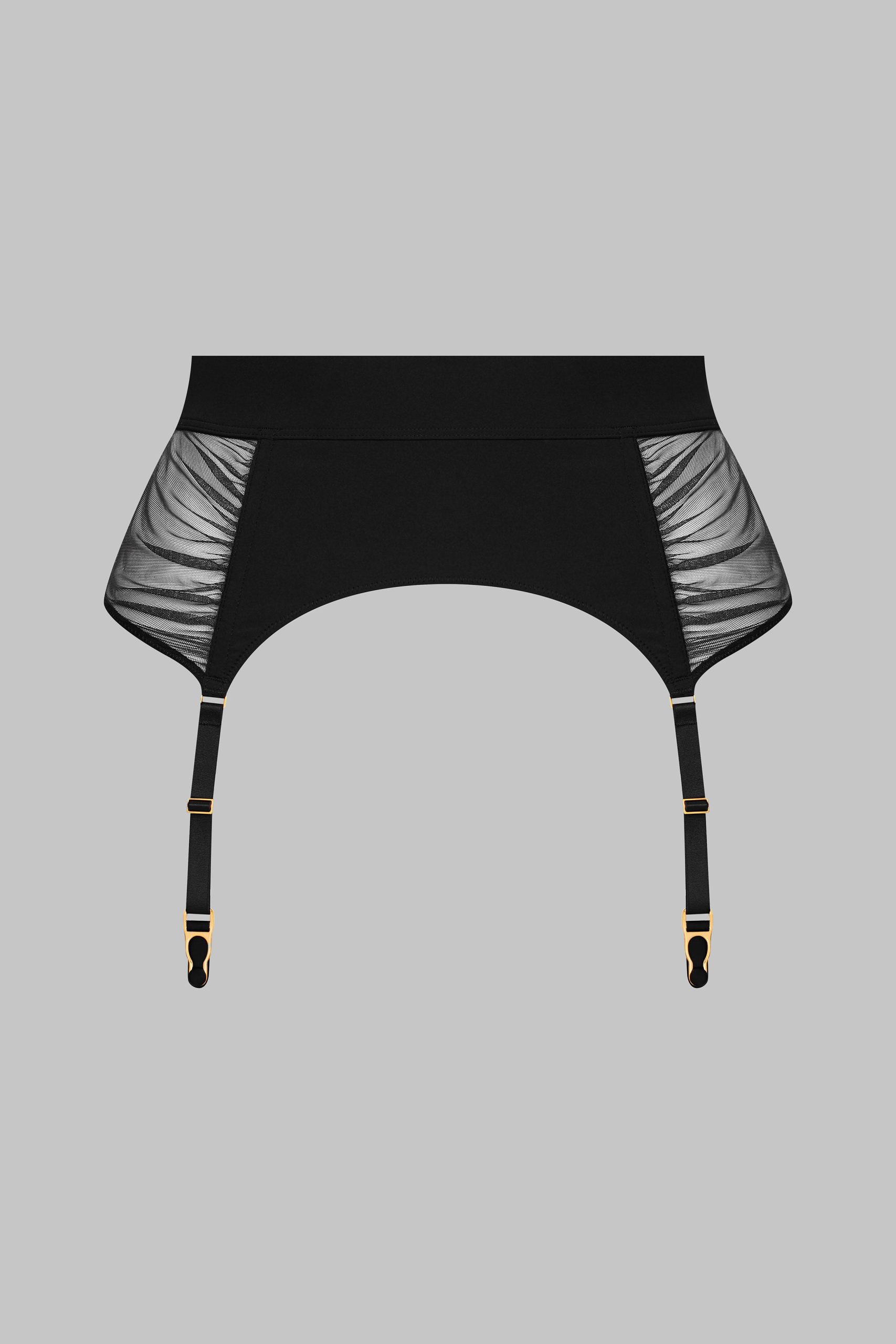 Bi-material garter belt with sides feature transparent tulle structured with pleated seams that define the hips. Adjustable elasticated waistband fastening in opaque material with a smooth, fine hook and eye fastening. The opaque front and back material offers discretion. Four adjustable, non-removable suspenders, with gold accessories, for stockings to complete the look.