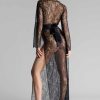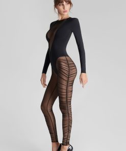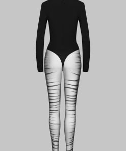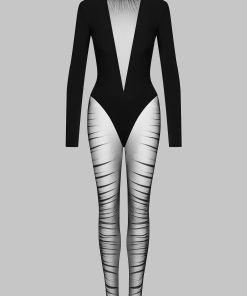 Long-sleeved bi-material catsuit. An opaque high-cut bodysuit emerges from the round neckline, giving way to pleated tulle for a deep V-neckline. The legs are adorned with the same tiger-effect beneath a subtle transparency. A jumpsuit enhanced by contrasting materials. The back features zip fastening embellished with a gold jewel.