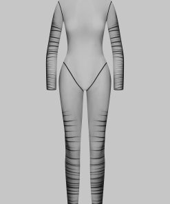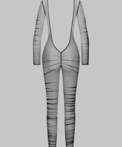 Fully sheer tulle catsuit with seamed pleats across the body. The back reveals the skin with a deep V-neckline. This ultra-visual body is enhanced by a tiger effect. Delicately trimmed with opaque material at the collar and back of the neck.