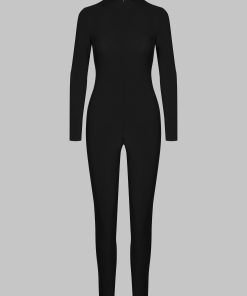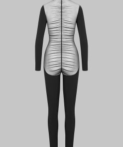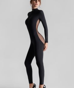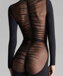 A long-sleeved, bi-material catsuit, where the back makes a bold statement beneath a completely transparent tulle, structured with pleats and seams that extend right down to the buttocks. At the front, an entirely opaque material creates a double light-dark effect. A zip with a gold jewel opens from the high collar.