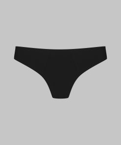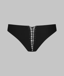 An open brief with adjustable lacing at the back, revealing the curves of the buttocks. At the front, structured opacity with two cut-outs ensures discretion. Black tone-on-tone metal eyelets and adjusters allow precise sliding of the rigid cords.