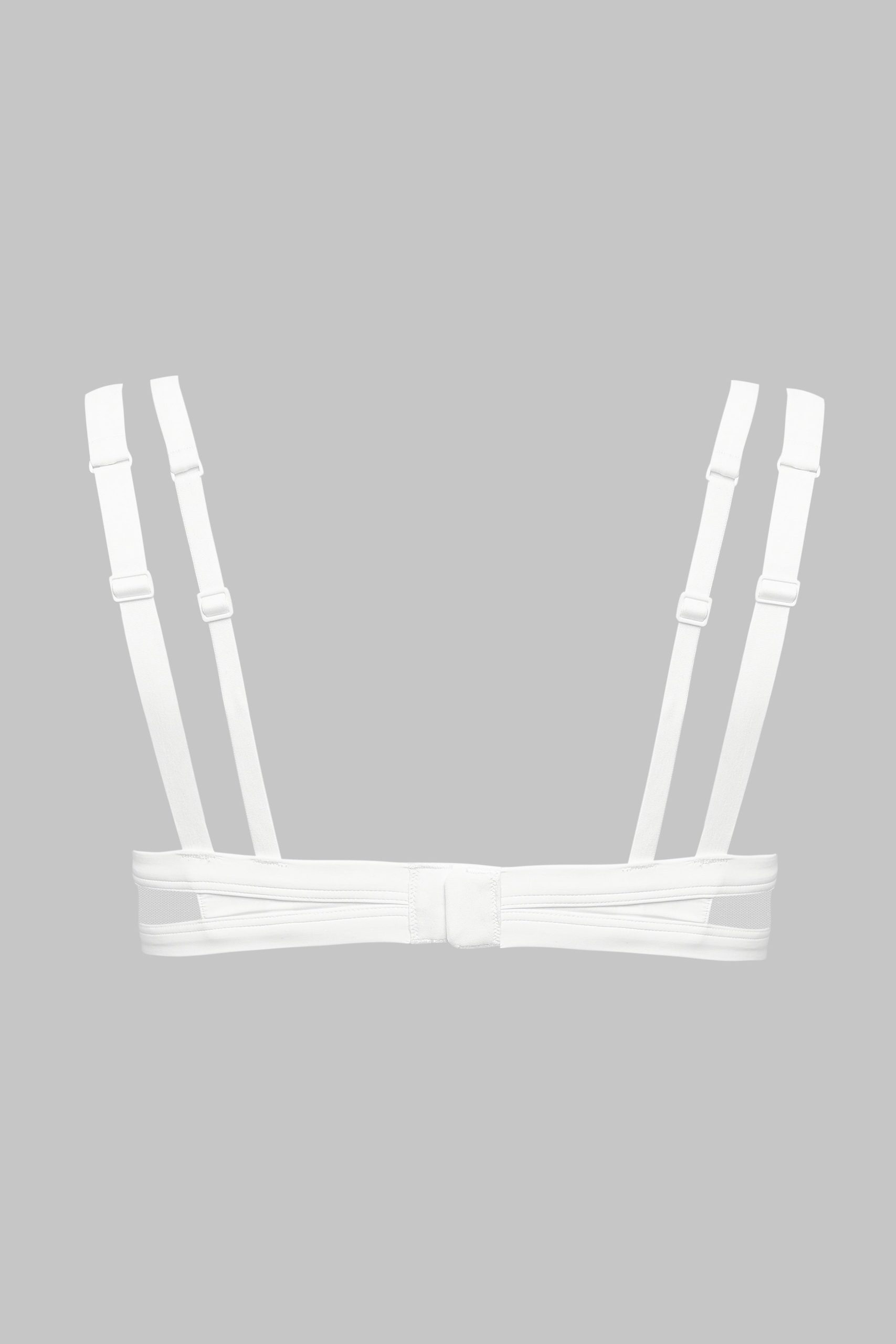 Its two-material construction combines sheer tulle and opaque microfiber in a subtle dialogue between lightness and coverage. Underwires provide precise support, while the adjustable integrated harness highlights the neckline with confident intent. Adjustable hook-and-eye closure at the back.