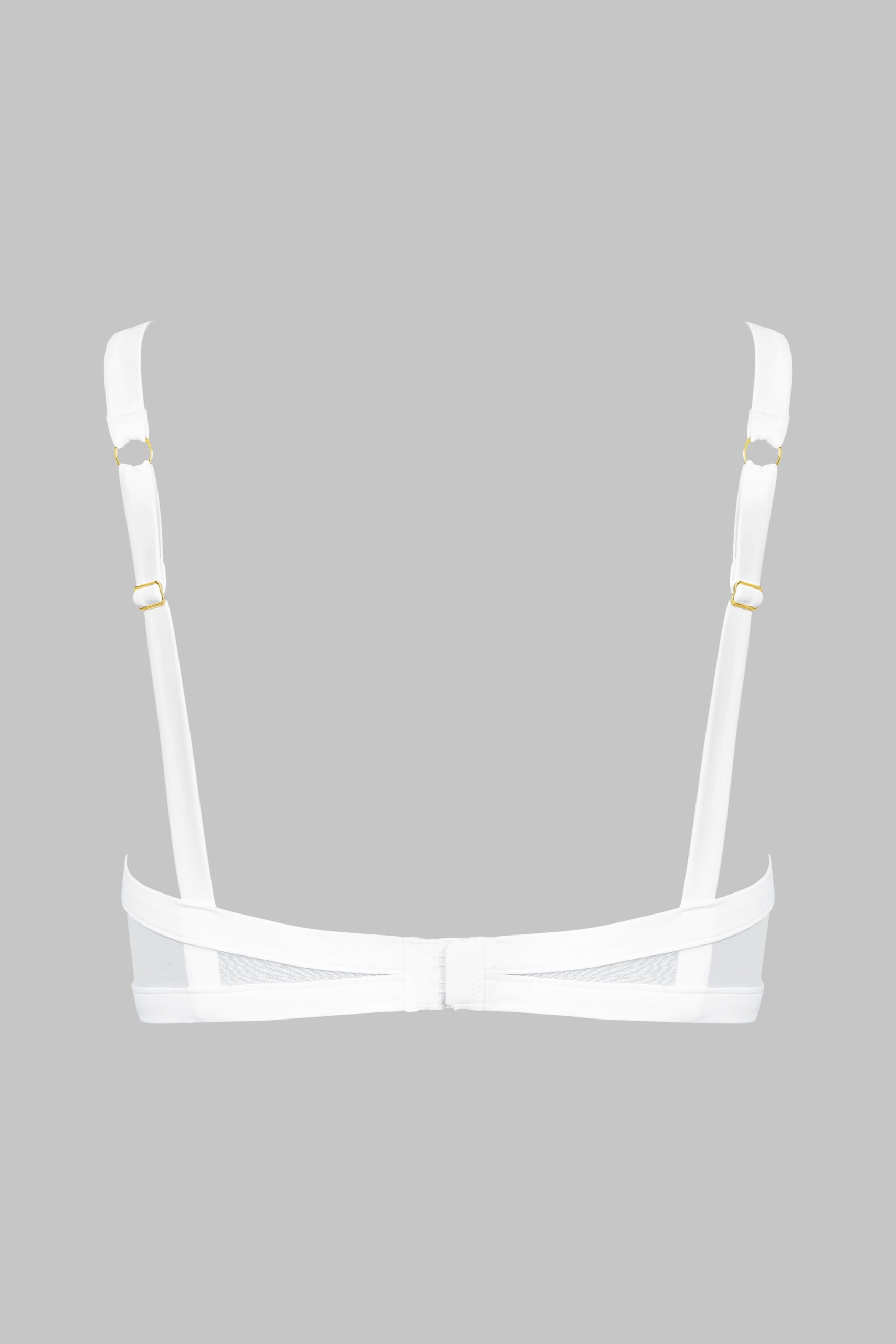 Underwired peekaboo bra with wide straps covered with semi opaque microfibre. Tulle insert at back. This piece has no cups and boldly reveals your breasts. Adjustable straps with gold hardware ensure a snug fit. Closes at the back with a comfortable hook and eye fastening.