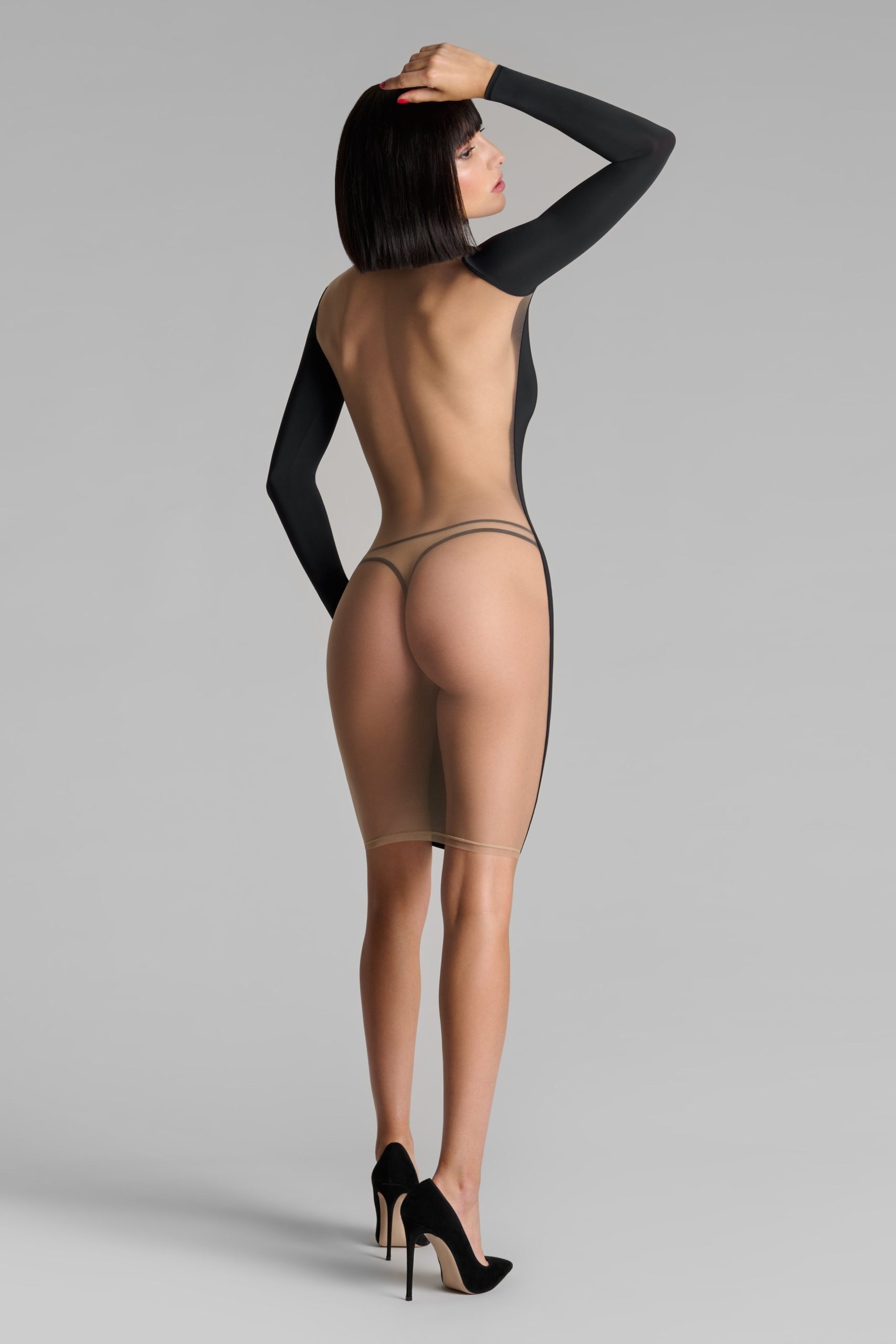 The long-sleeve sheer-back dress Pure Tentation explores the balance between structure and suggestion. Made from sheer tulle and opaque microfiber, it shapes a mid-length silhouette that is both refined and deeply sensual.