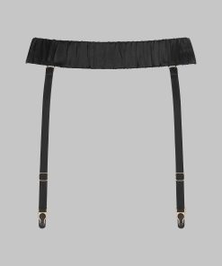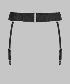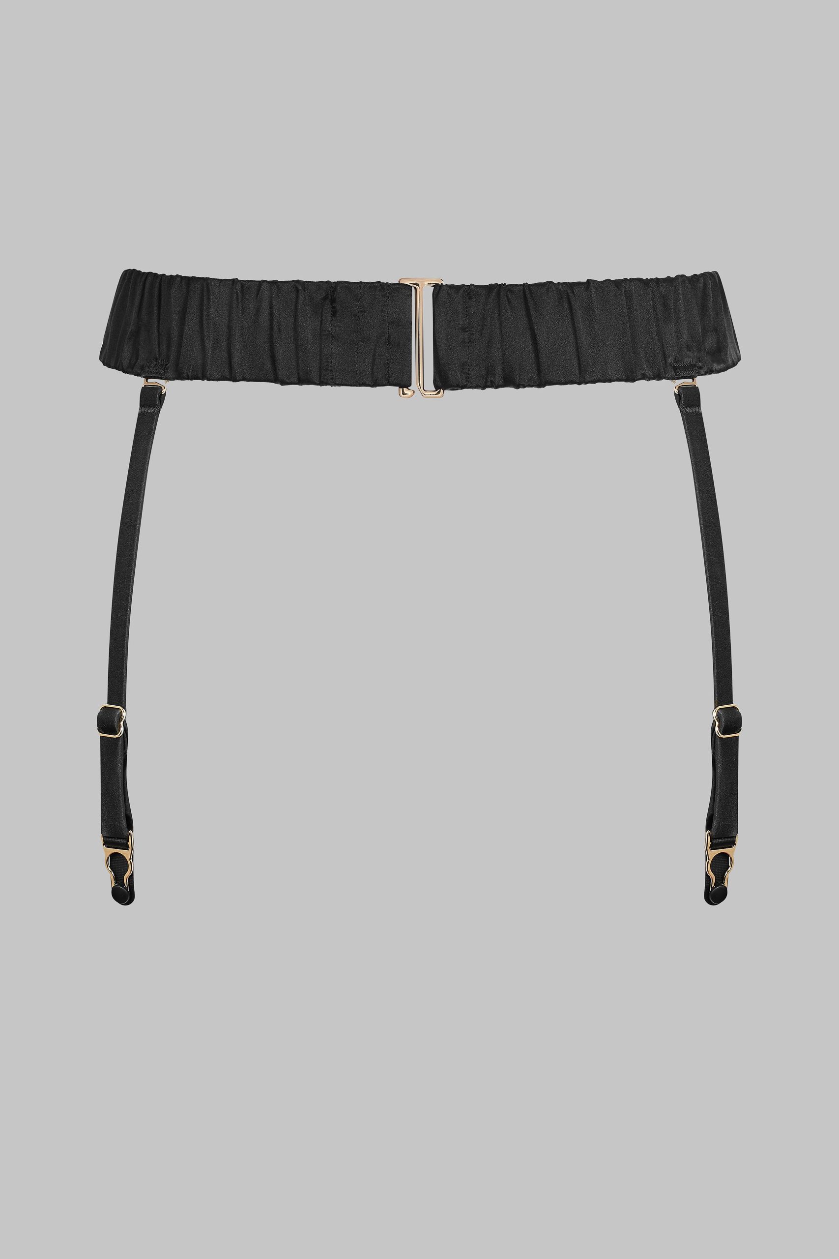 Suspender belt in natural silk. An elastic waistband covered in gathered silk and accessorised with a golden clasp. Golden decorative attachment to place on the front or the back according to your desires. Four detachable, adjustable suspender straps with gold accents. The two short suspenders are placed at the front, the two longer suspenders at the back.