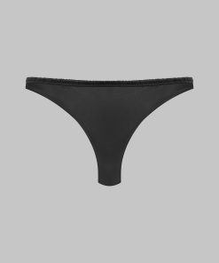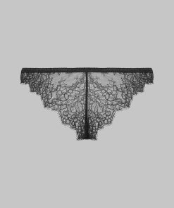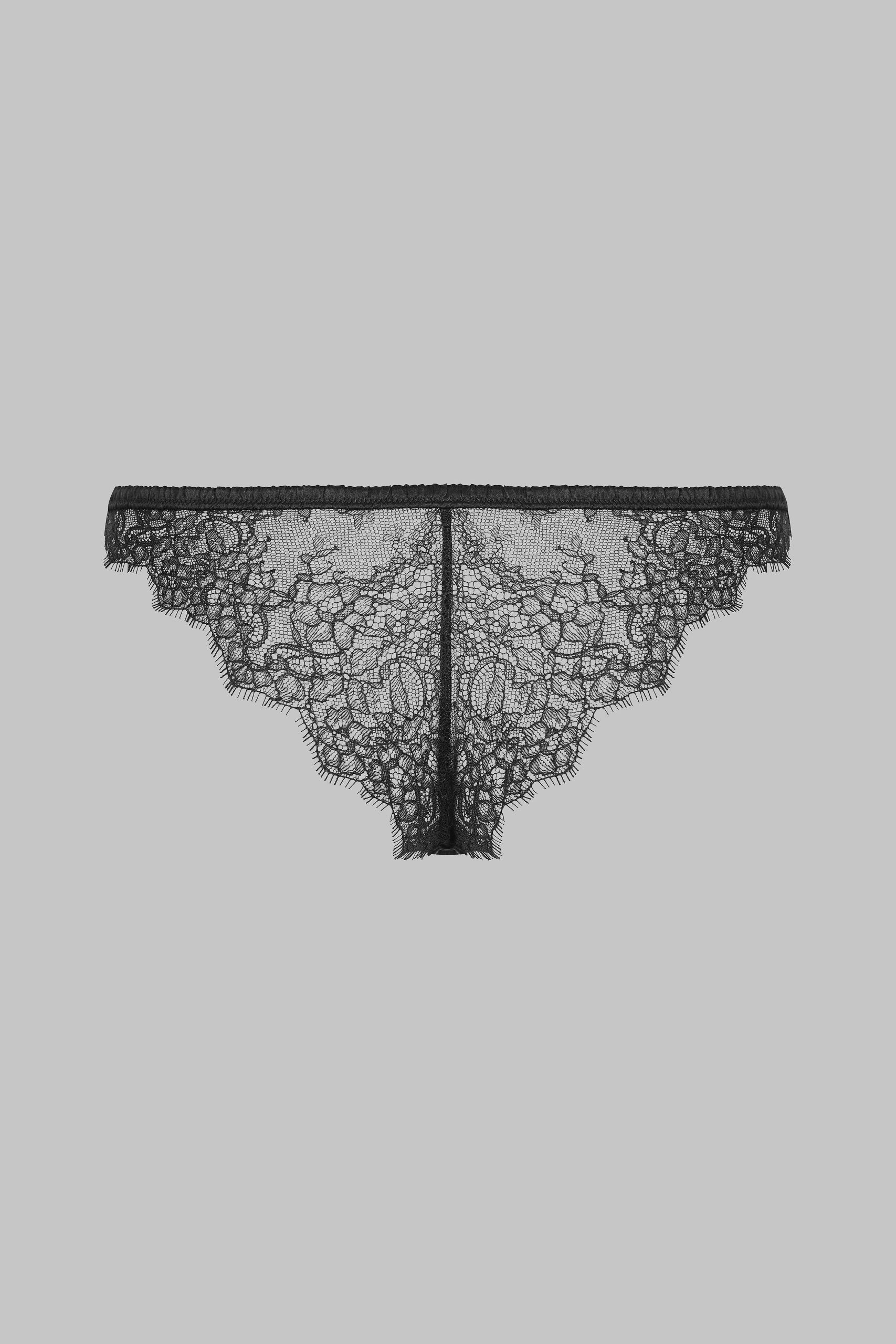 Panties in silk and eyelash lace. Back in rigid lace for a subtly sheer accentuation of the buttocks. A thin elastic waistband covered by gathered silk.