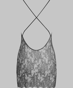 Short dress in sheer eyelash lace. V neckline and a bare back delicately hug the body. Fine silk adjustable straps with golden accessories cross the back.