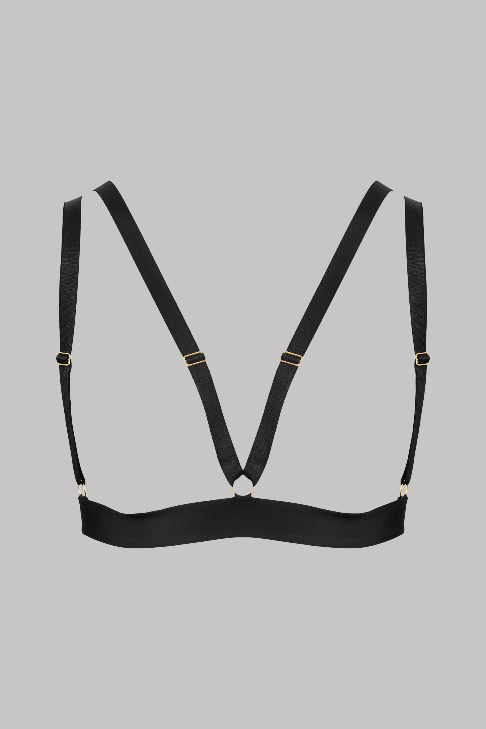 Cupless harness with adjustable straps. Underarm straps can be worn at the front or at the back. Elasticated underband covered with opaque microfibre.