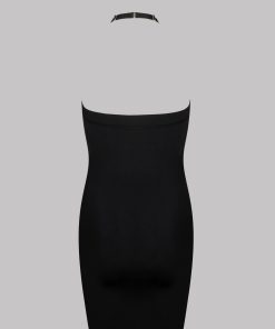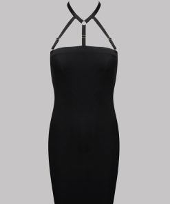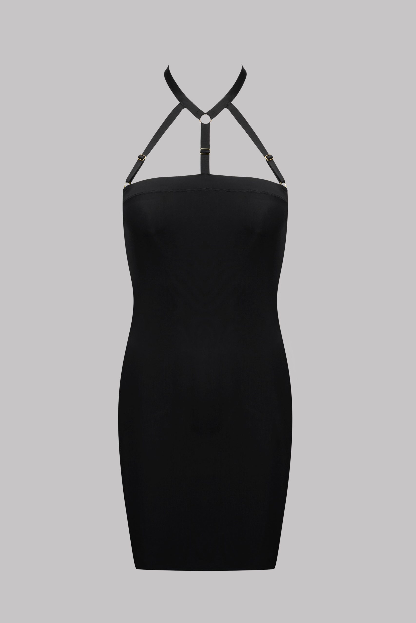 Opaque microfibre bondage dress. Harnessed around the neck with elasticated, adjustable straps. Openable neck strap. Heat bonded seams for a smooth, seamless look.