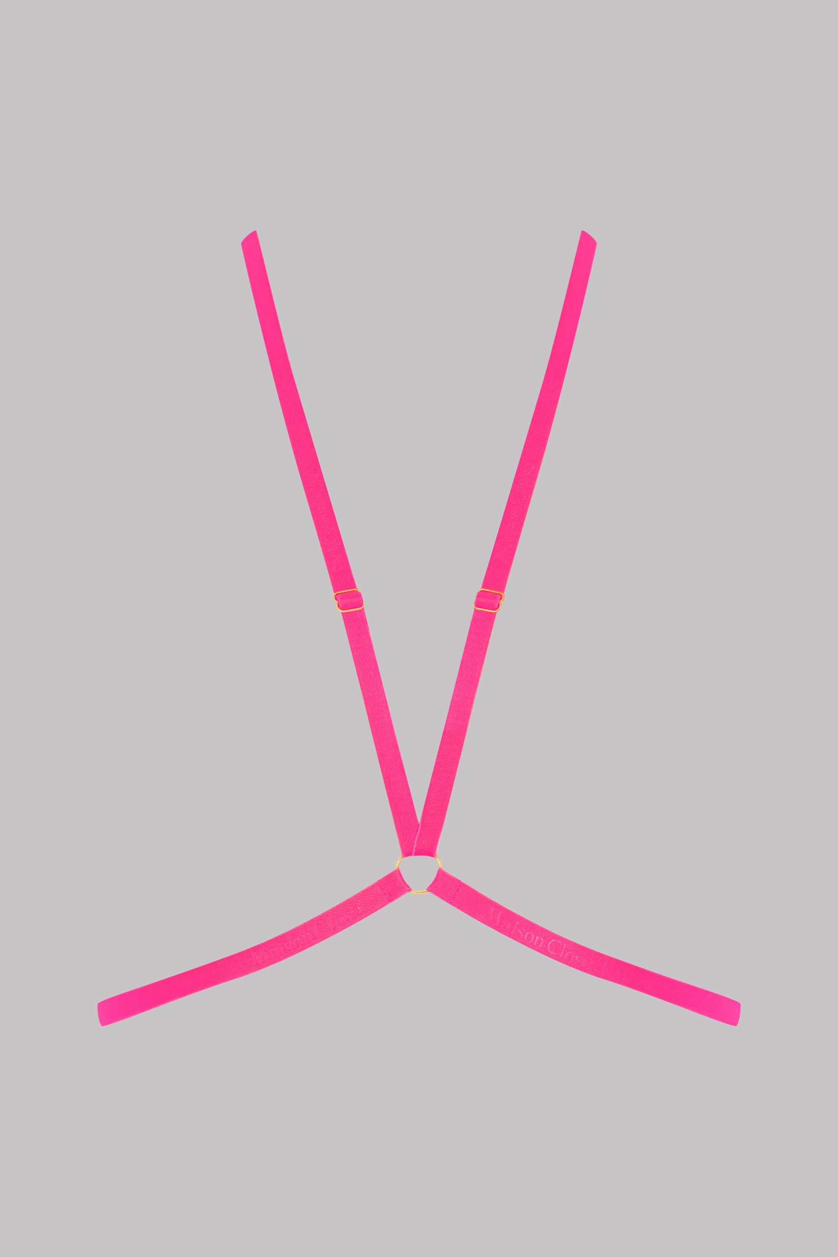 Neon Signature harness stamped with the Maison Close logo. Elasticated bands linked with a ring, with adjustable gold sliders. Wear between cleavage or at the back to suit you. Clip fastening on the back.