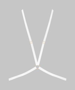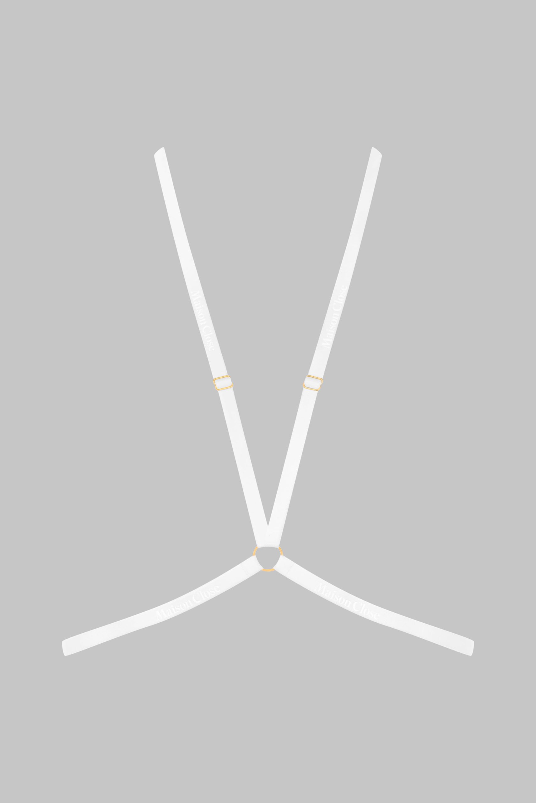 White Signature harness stamped with the Maison Close logo. Elasticated bands linked with a ring, with adjustable gold sliders. Wear between cleavage or at the back to suit you. Clip fastening on the back.