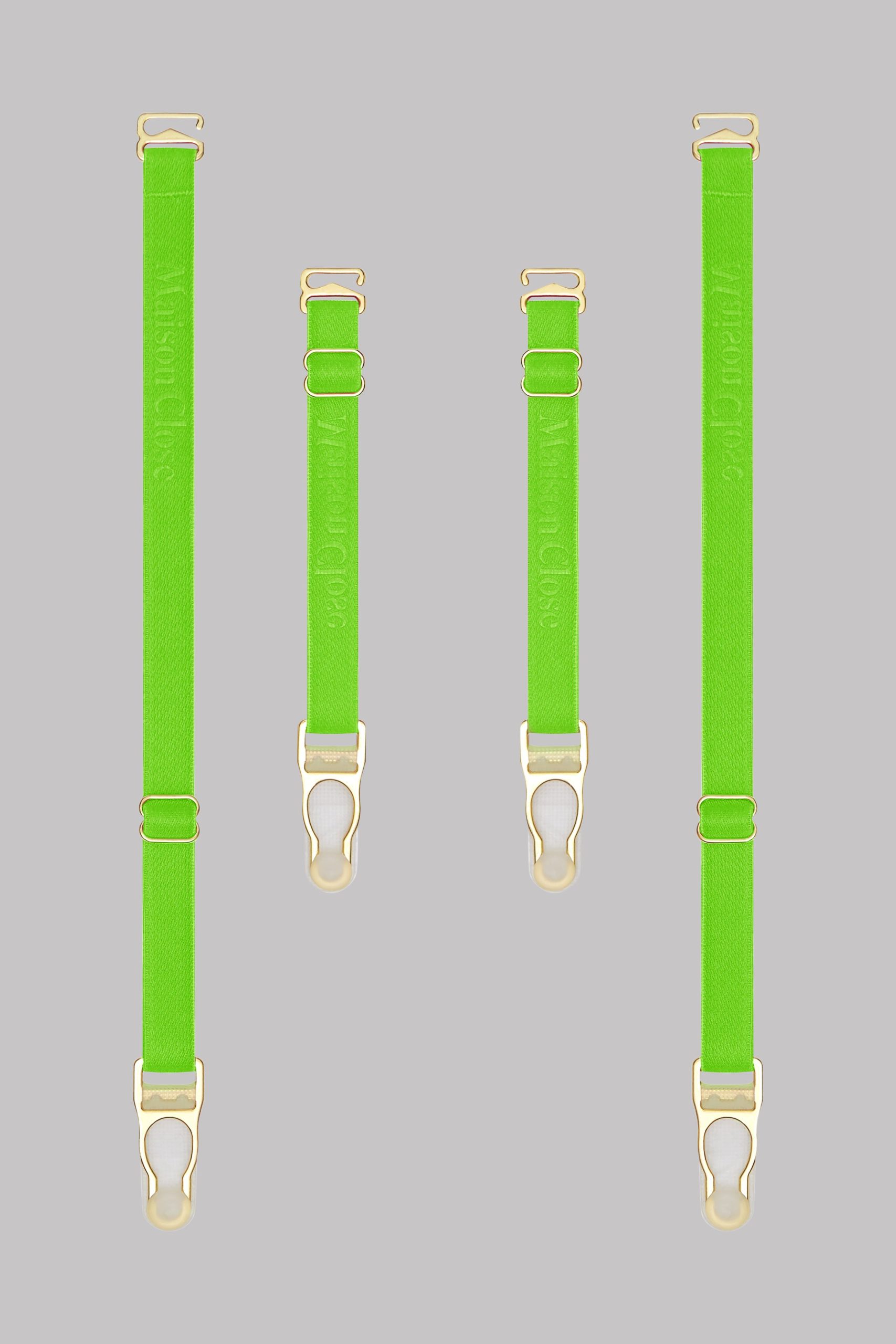 Four neon detachable, adjustable Signature suspender straps with gold accents. Team with other Signature items available in various colours. An opportunity for each Muse to create their own zingy mix and match.